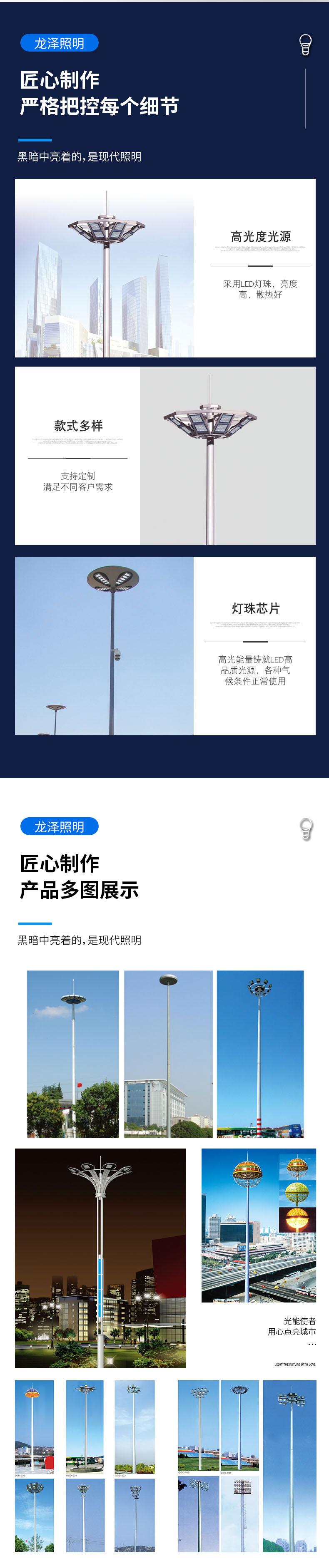 高桿燈桿件選用寶鋼集團優質Q235型號鋼板,經大型號剪板機下料、1200噸大型壓力機成型后焊接、校直、熱鍍鋅、噴塑而成。 可根據用戶需求生產不同長度、不同規格、不同噴塑色彩的市政路燈!